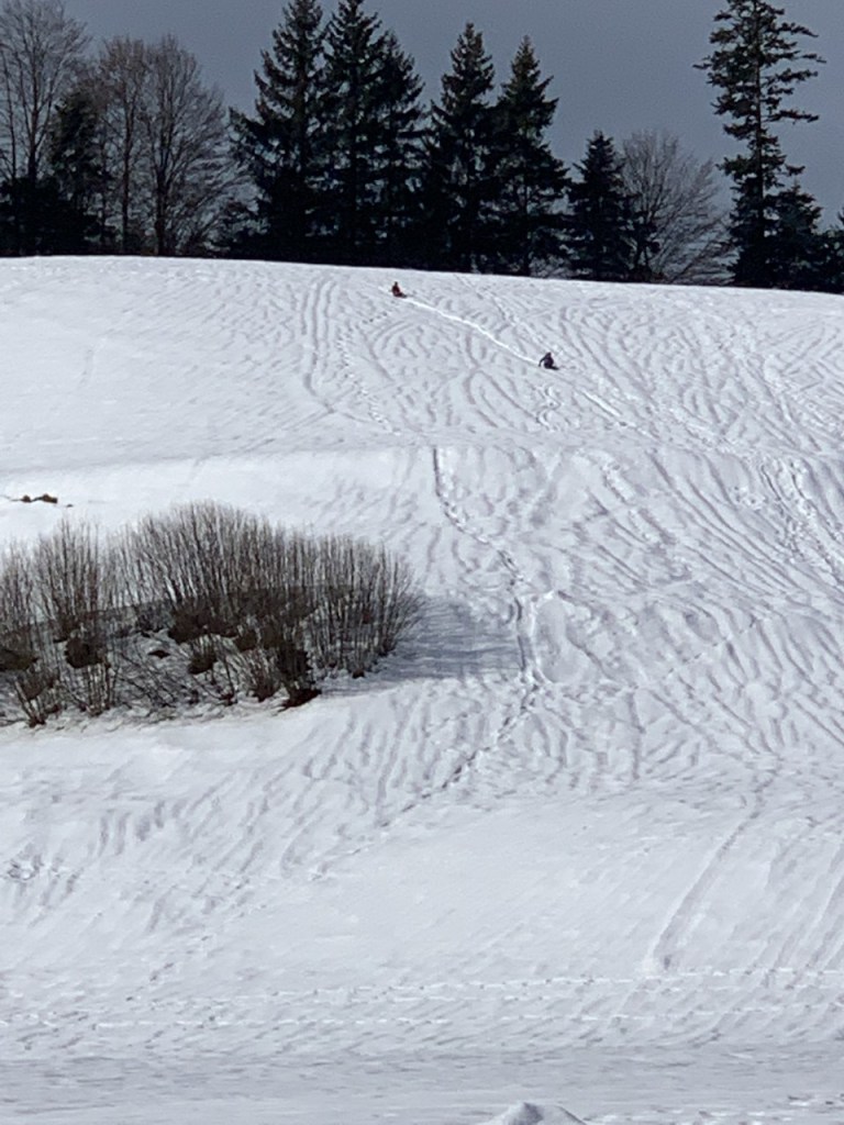 I enjoyed watching these two children having fun out on their toboggans, a great slope for sliding down, with a bit of a bump in the middle, but a long walk back up. I was brought up in a town, so can only imagine what fun it must be to have a natural snow park like this on your doorstep.